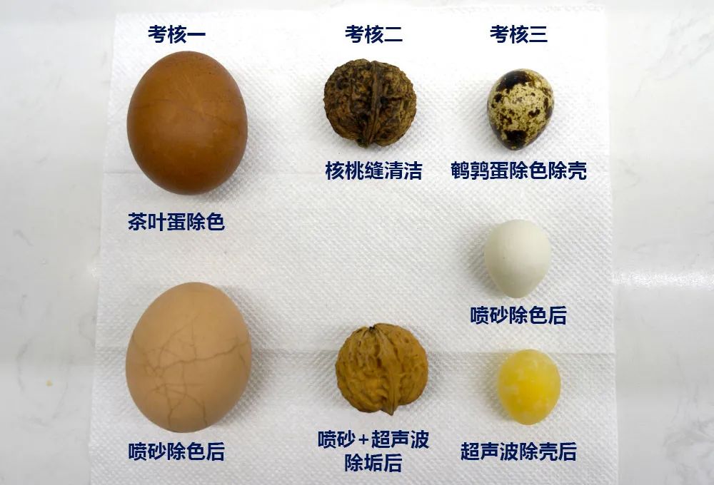 選手對鵪鶉蛋進行噴砂除色、超聲波除殼操作