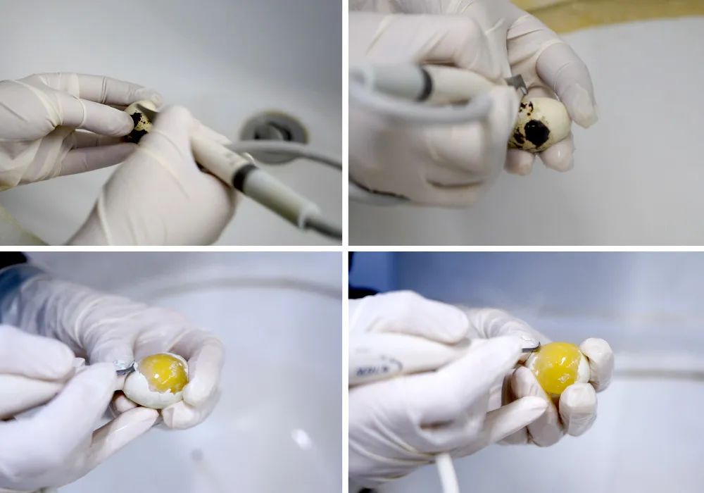 最后的終極檢驗環節,選手們需要在有限時間內先除去鵪鶉蛋表面污漬、斑點,然后通過超聲波去除鵪鶉蛋殼并保持蛋膜飽滿無破損。這不僅考驗潔治力度與手速,更是對選手的潔牙手法技巧、潔牙針尖切入角度和心態的綜合挑戰。