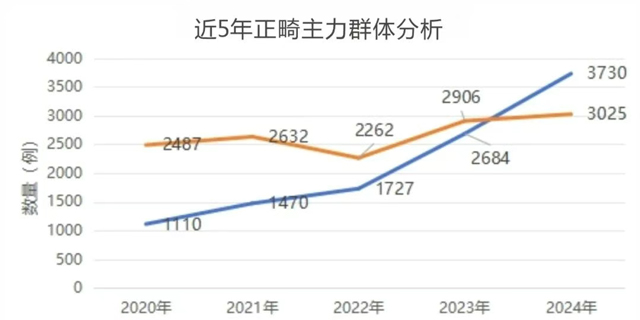 《報(bào)告》揭示了過(guò)去五年(2020-2024年)成都正畸市場(chǎng)的顯著變化——青少年群體(18歲以下)正畸需求呈現(xiàn)爆發(fā)式增長(zhǎng)。數(shù)據(jù)顯示:青少年正畸占比從2020年的30.86%(1110例)躍升至2024年的55.22%(3730例),五年增幅達(dá)236%。其中2023年增速最為迅猛,推動(dòng)當(dāng)年總患者量突破5000例。相比之下,成人群體(18歲及以上)正畸需求增長(zhǎng)相對(duì)平緩且波動(dòng)較大,五年間增幅為21.63%。