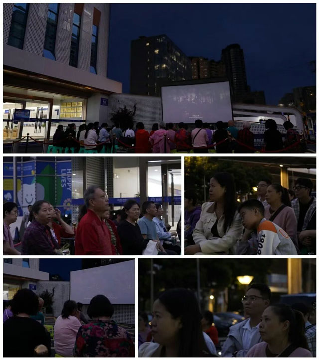 活動當晚,新橋口腔成都總院(成都人南新橋口腔醫(yī)院)正門前被精心布置為溫馨的“臨時露天影院”,并貼心準備了零食和飲用水。受邀前來的社區(qū)居民在工作人員引導下有序簽到、落座,滿懷期待地等待電影開場。